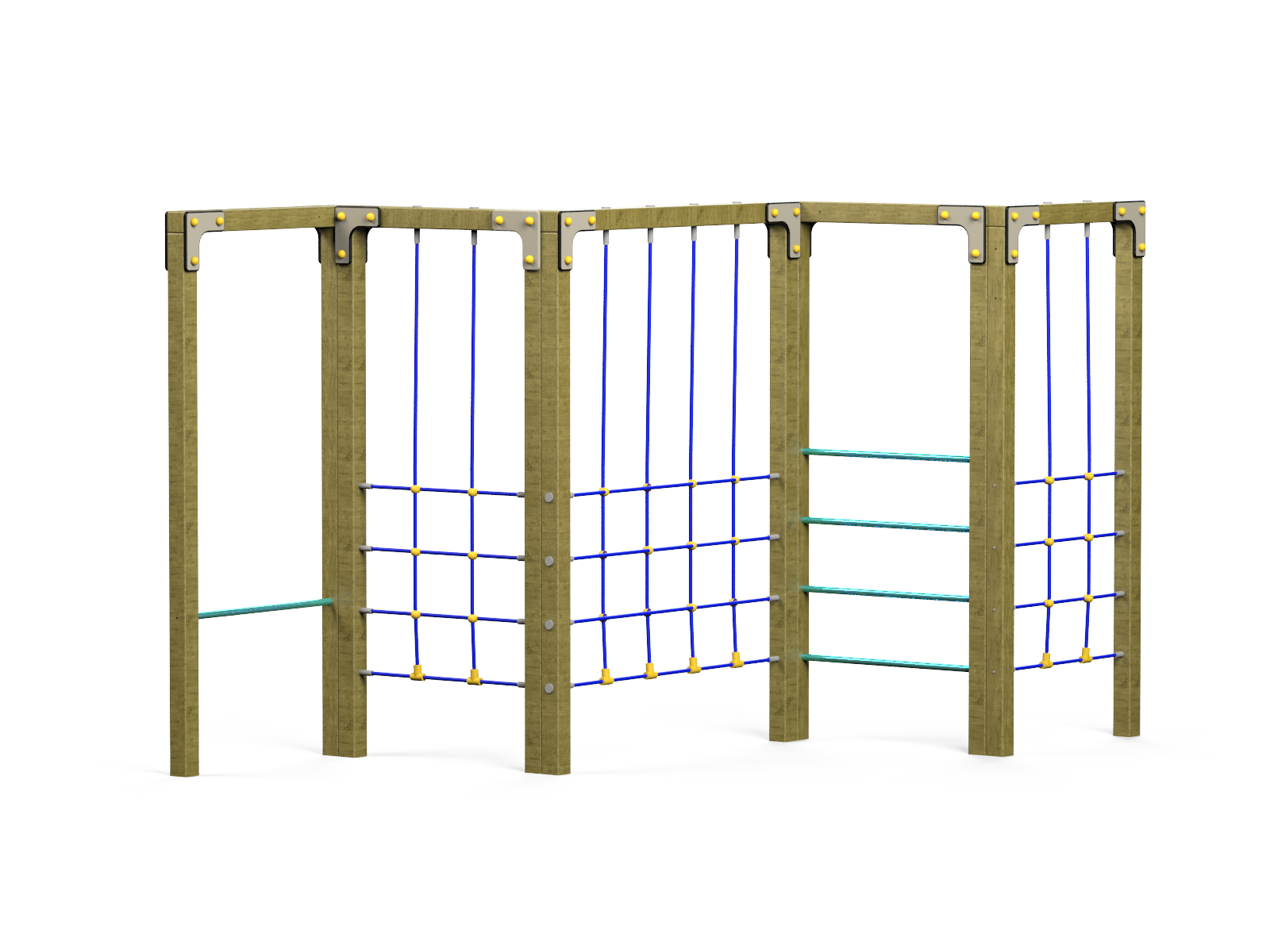 La estructura Maga es un elemento diseñado para desafiar las habilidades motoras de los niños a través de la escalada y el equilibrio. Su estructura de madera combina tres módulos de redes de escalada y dos módulos de barras, proporcionando múltiples formas de juego que fomentan la coordinación, la fuerza y la confianza.