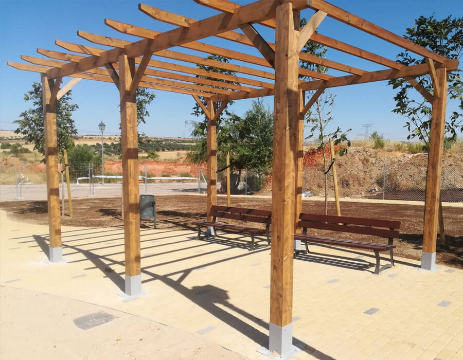 Pérgola fabricada en madera de pino para proyectar sombras en jardines o porches. Fabricado en madera de pino sueco tratado en autoclave nivel IV. Acabada con lasur a poro abierto como protector contra la foto-degradación por los rayos ultravioleta.