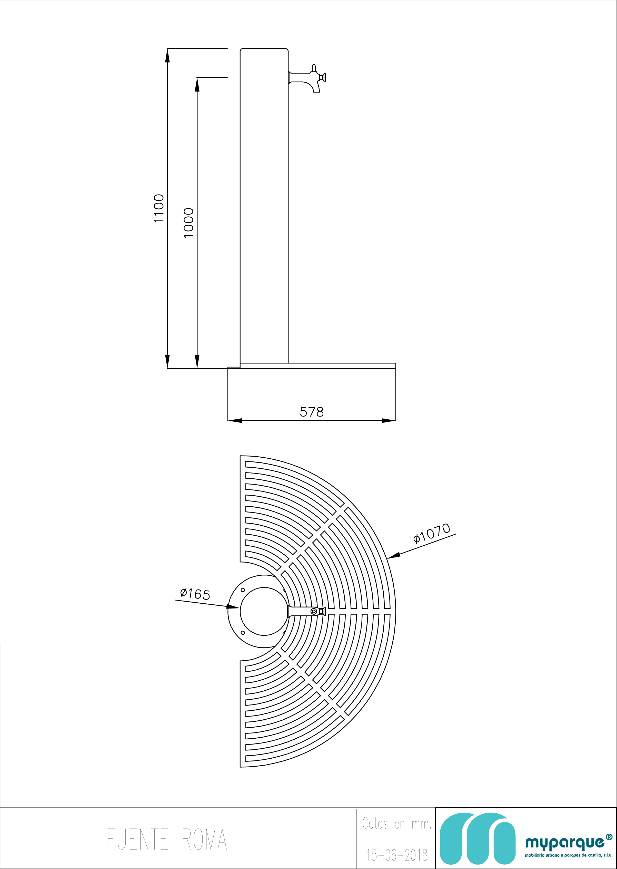 Fuente redonda con un grifo pulsado y con rejilla de desagüe en la base. Estructura metálica formada por chapa de acero de 3mm. Rejilla en fundición dúctil. La estructura ha sido pintada mediante una mano de imprimación y dos manos de oxirón negro forja.