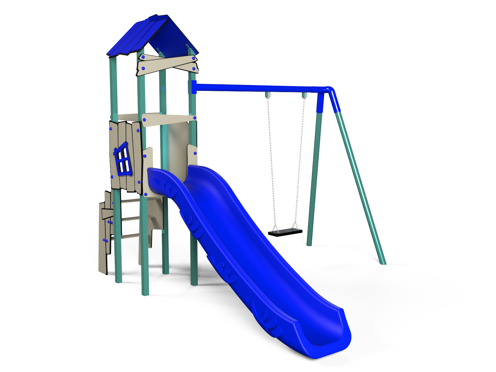 La estructura multijuego Zuiver de la serie Kabanias de MyParque es un espacio de juego diseñado para ofrecer diversión y seguridad. Esta estructura está compuesta por una torre central que incluye un tobogán, una escalera y un columpio uniplaza, creando un entorno donde los niños pueden explorar y desarrollar sus habilidades físicas de manera segura. Zuiver es ideal para parques y áreas recreativas que buscan un diseño compacto y funcional.