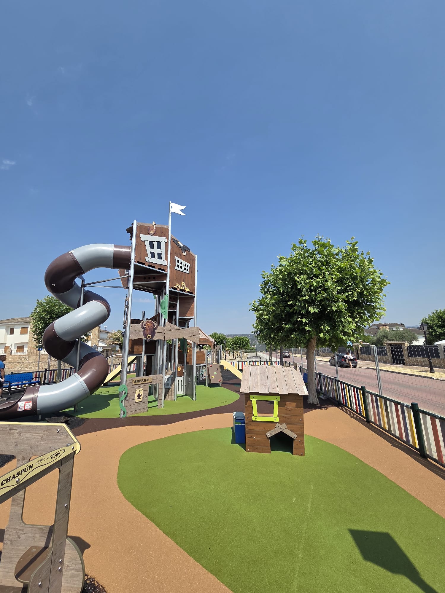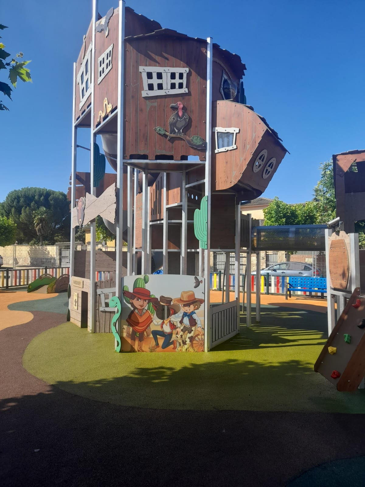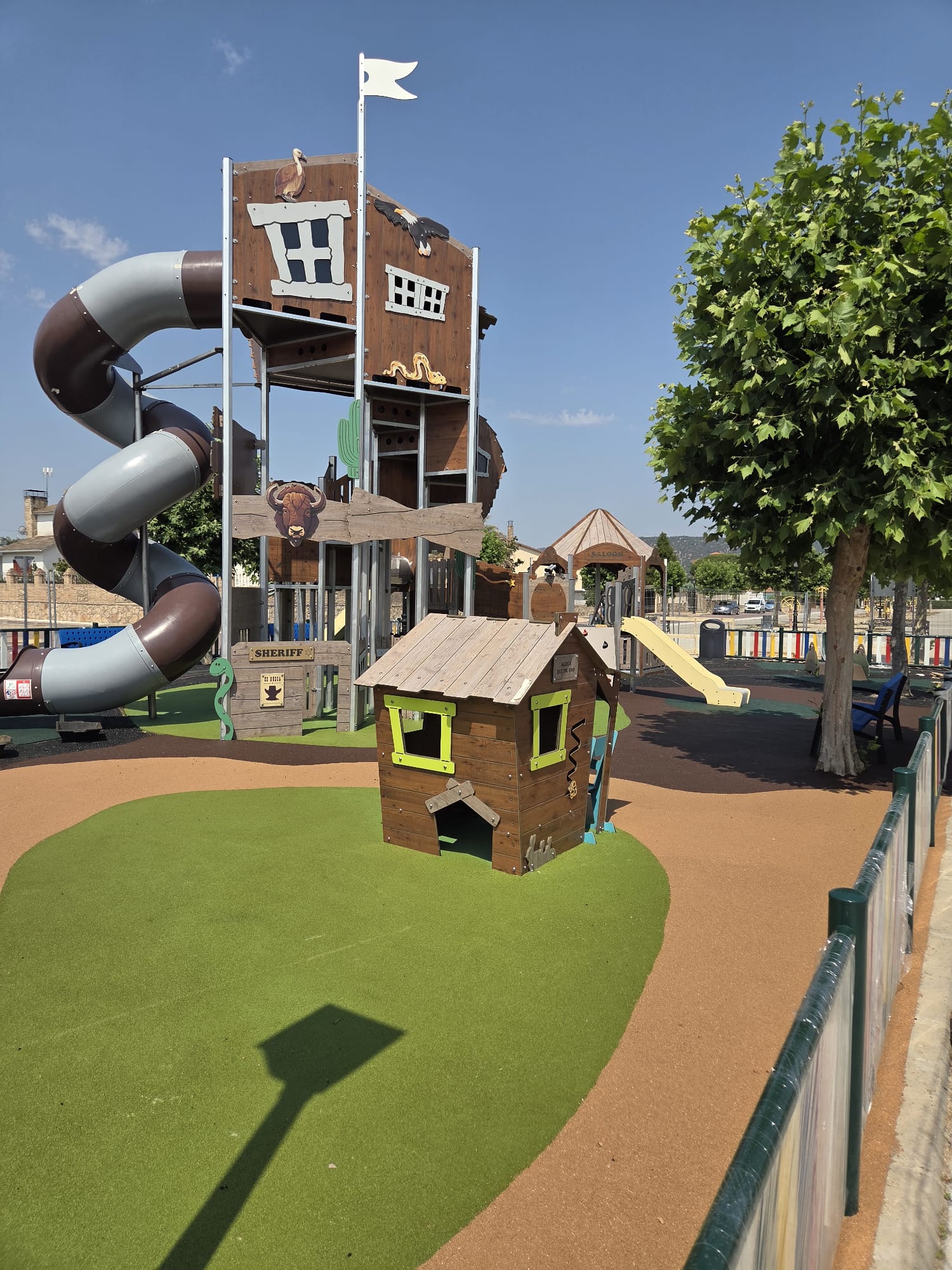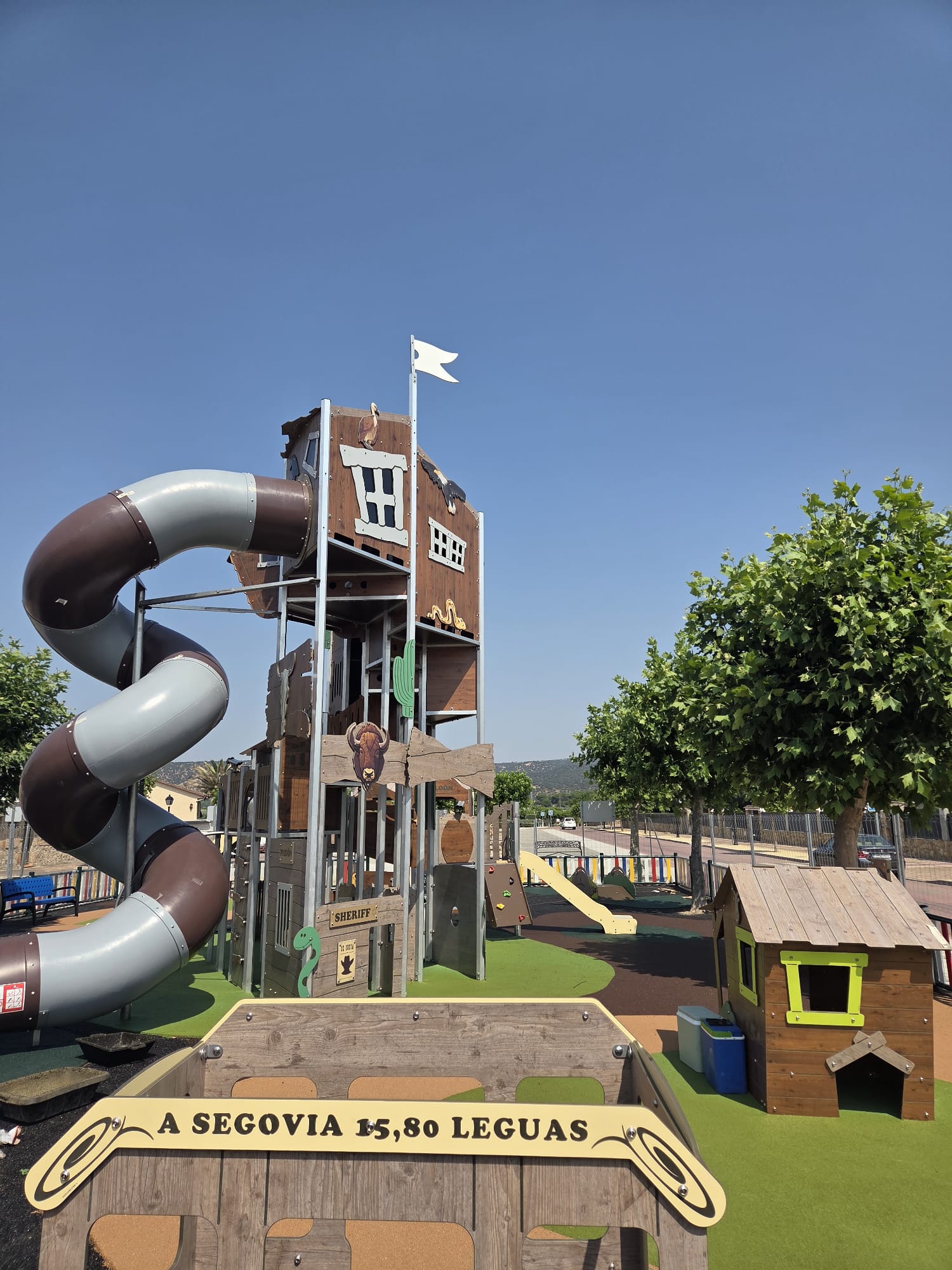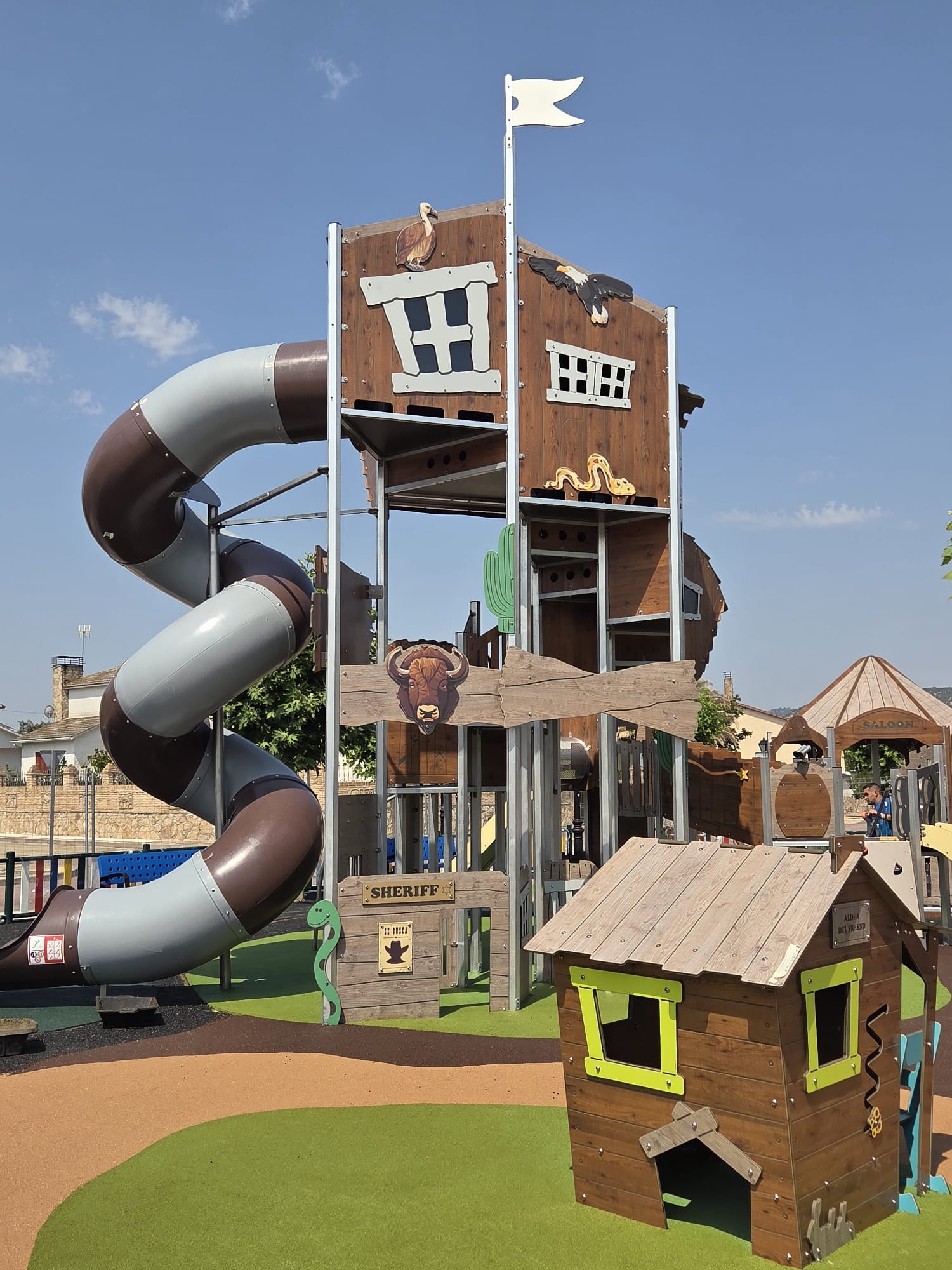 El parque se estructura en torno a un gran multijuego de madera inspirado en el imaginario del oeste y la aventura, con torres de distintas alturas, pasarelas, miradores y toboganes tubulares que conectan los diferentes niveles. La disposición vertical y los múltiples recorridos invitan a los niños a escalar, descubrir y desplazarse libremente, fomentando el juego activo, el reto físico y la imaginación.