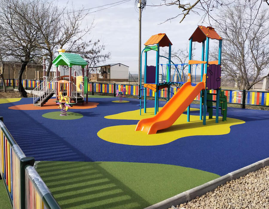 Se ha completado la zona infantil con la instalación de una estructura Kekkila de la serie Kabanias, pavimento continuo de seguridad y vallado perimetral de la zona.
