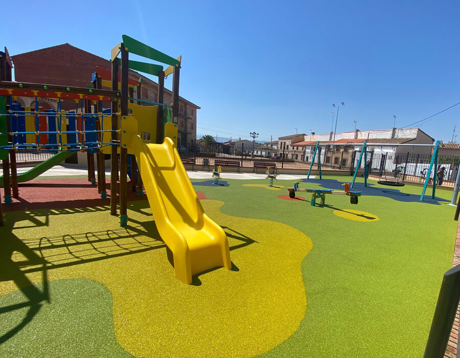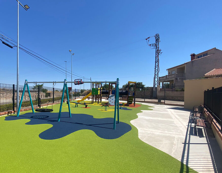 Se ha habilitado una nueva zona infantil con una estructura Marsa de la serie Phineas, varios muelles y balancines y un columpio serie Ka de doble pórtico con asientos nido, cuna y plano y pavimento continuo de seguridad, acompañado de varios bancos modelo Alcobendas fabricados con madera técnica.