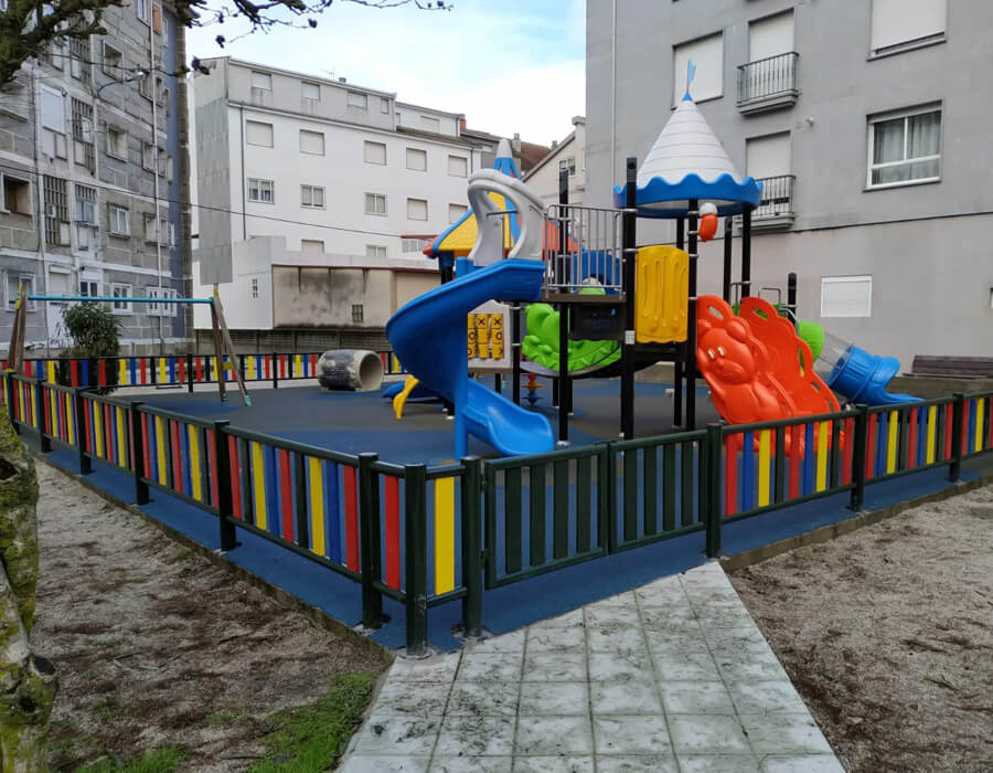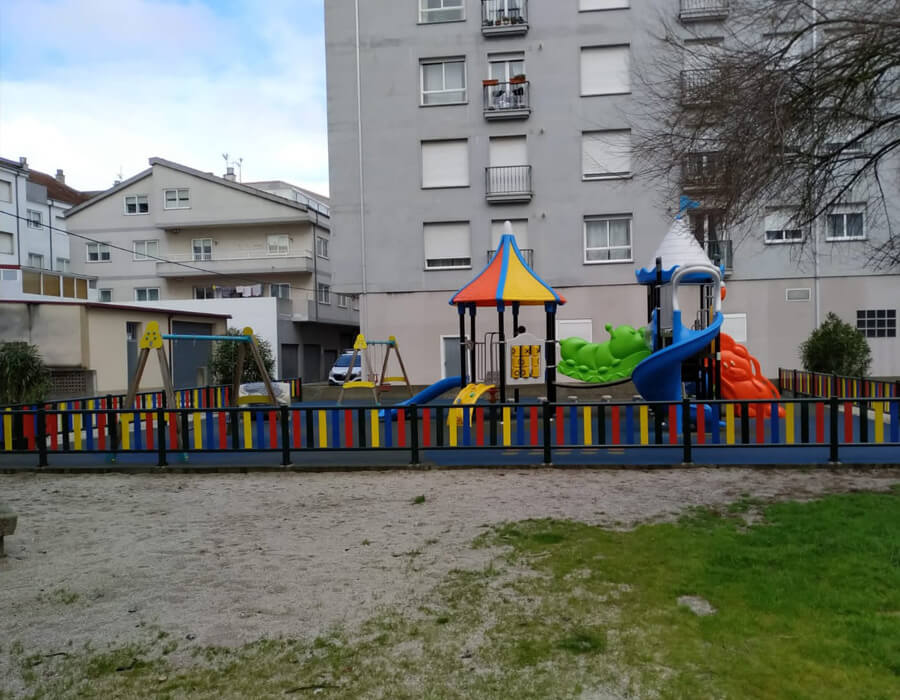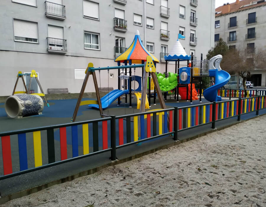 Parque infantil con gran variedad de toboganes, juegos variados y columpios acompañados de la seguridad que aporta el pavimento continuo y el vallado cerrado con puertas abatibles.